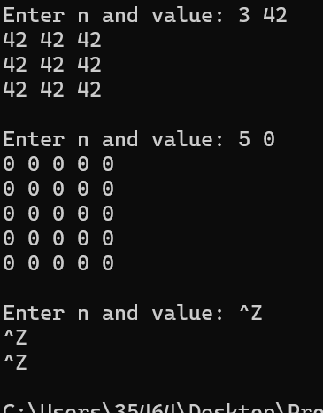 1 #include <stdio.h> 2 #define N 100 3 4 // 函数声明 5 void output(int x[][N], int n); 6 void init(int x[][N], int n, int value); 7 8 int main() { 9 int x[N][N]; 10 int n, value; 11 12 while (printf("Enter n and value: "), scanf("%d%d", &n, &value) != EOF) { 13 init(x, n, value); // 函数调用 14 output(x, n); // 函数调用 15 printf("\n"); 16 } 17 18 return 0; 19 } 20 21 // 函数定义 22 void output(int x[][N], int n) { 23 int i, j; 24 25 for (i = 0; i < n; ++i) { 26 for (j = 0; j < n; ++j) 27 printf("%d ", x[i][j]); 28 printf("\n"); 29 } 30 } 31 32 // 函数定义 33 void init(int x[][N], int n, int value) { 34 int i, j; 35 36 for (i = 0; i < n; ++i) 37 for (j = 0; j < n; ++j) 38 x[i][j] = value; 39 }
