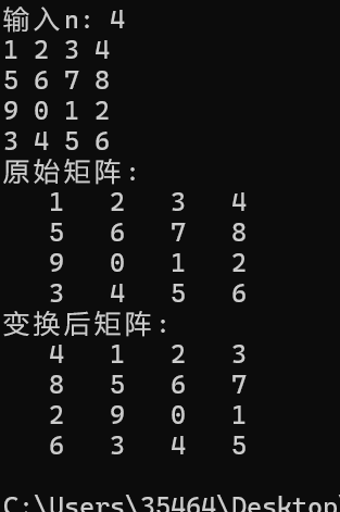 #include <stdio.h> #define N 100 // 函数声明 void input(int x[][N], int n); void output(int x[][N], int n); // 函数rotate_to_right声明 // 待补足 // ××× void rotate_to_right(int x[][N], int n); int main() { int x[N][N]; int n; printf("输入n: "); scanf("%d", &n); input(x, n); printf("原始矩阵:\n"); output(x, n); // 函数rotate_to_right调用 // 待补足 rotate_to_right(x, n); printf("变换后矩阵:\n"); output(x, n); return 0; } // 函数定义 // 功能: 输入一个n*n的矩阵x void input(int x[][N], int n) { int i, j; for (i = 0; i < n; ++i) { for (j = 0; j < n; ++j) scanf("%d", &x[i][j]); } } // 函数定义 // 功能: 输出一个n*n的矩阵x void output(int x[][N], int n) { int i, j; for (i = 0; i < n; ++i) { for (j = 0; j < n; ++j) printf("%4d", x[i][j]); printf("\n"); } } // 函数rotate_to_right定义 // 功能: 把一个n*n的矩阵x,每一列向右移, 最右边被移出去的一列绕回左边 // 待补足 // xxx void rotate_to_right(int x[][N], int n) { int i, j; int temp[N]; for (i = 0; i < n; ++i){ temp[i] = x[i][n - 1]; } for (j = n - 1; j > 0; --j){ for (i = 0; i < n; ++i){ x[i][j] = x[i][j - 1]; } } for (i = 0; i < n; ++i){ x[i][0] = temp[i]; } }