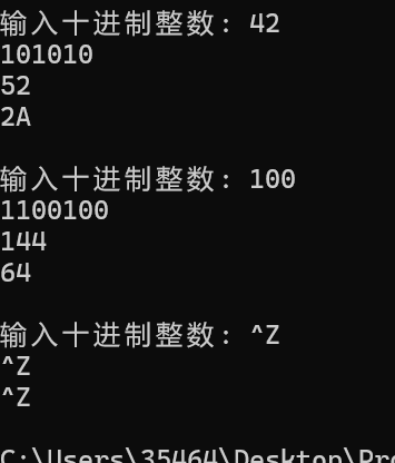 1 #include <stdio.h> 2 #define N 100 3 4 void dec_to_n(int x, int n); // 函数声明 5 6 int main() { 7 int x; 8 9 while (printf("输入十进制整数: "), scanf_s("%d", &x) != EOF) { 10 dec_to_n(x, 2); // 函数调用: 把x转换成二进制输出 11 dec_to_n(x, 8); // 函数调用: 把x转换成八进制输出 12 dec_to_n(x, 16); // 函数调用: 把x转换成十六进制输出 13 14 printf("\n"); 15 } 16 17 return 0; 18 } 19 20 // 函数定义 21 // 功能: 把十进制数x转换成n进制,打印输出 22 // 补足函数实现 23 // xxx 24 void dec_to_n(int x, int n) { 25 char digits[] = "0123456789ABCDEF"; 26 char result[N]; 27 int i = 0; 28 29 if (x == 0){ 30 printf("0"); 31 return; 32 } 33 34 while (x > 0){ 35 result[i++] = digits[x % n]; 36 x = x / n; 37 } 38 39 for (int j = i - 1; j >= 0; j--){ 40 printf("%c", result[j]); 41 } 42 printf("\n"); 43 }