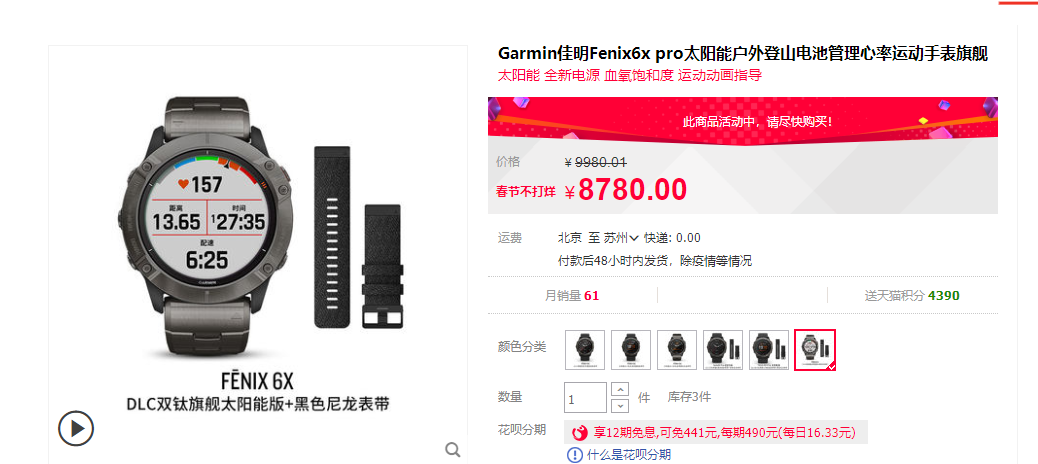 1、产品名称:Garmin佳明Fenix6xpro太阳能运动手表