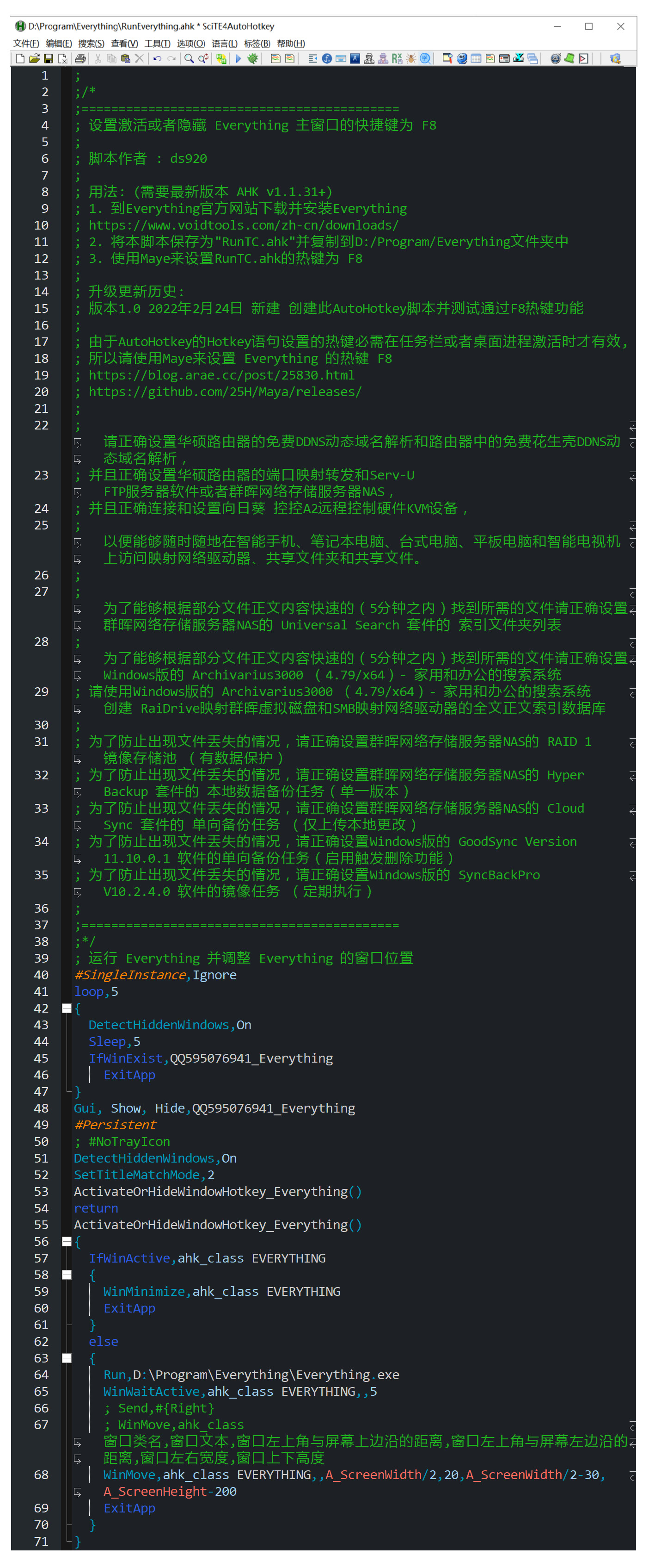 1 ; 2 ;/* 3 ;=========================================== 4 ; 设置激活或者隐藏 Everything 主窗口的快捷键为 F8 5 ; 6 ; 脚本作者 : ds920 7 ; 8 ; 用法: (需要最新版本 AHK v1.1.31+) 9 ; 1. 到Everything官方网站下载并安装Everything 10 ; https://www.voidtools.com/zh-cn/downloads/ 11 ; 2. 将本脚本保存为"RunTC.ahk"并复制到D:/Program/Everything文件夹中 12 ; 3. 使用Maye来设置RunTC.ahk的热键为 F8 13 ; 14 ; 升级更新历史: 15 ; 版本1.0 2022年2月24日 新建 创建此AutoHotkey脚本并测试通过F8热键功能 16 ; 17 ; 由于AutoHotkey的Hotkey语句设置的热键必需在任务栏或者桌面进程激活时才有效, 18 ; 所以请使用Maye来设置 Everything 的热键 F8 19 ; https://blog.arae.cc/post/25830.html 20 ; https://github.com/25H/Maya/releases/ 21 ; 22 ; 请正确设置华硕路由器的免费DDNS动态域名解析和路由器中的免费花生壳DDNS动态域名解析, 23 ; 并且正确设置华硕路由器的端口映射转发和Serv-U FTP服务器软件或者群晖网络存储服务器NAS, 24 ; 并且正确连接和设置向日葵 控控A2远程控制硬件KVM设备, 25 ; 以便能够随时随地在智能手机、笔记本电脑、台式电脑、平板电脑和智能电视机上访问映射网络驱动器、共享文件夹和共享文件。 26 ; 27 ; 为了能够根据部分文件正文内容快速的(5分钟之内)找到所需的文件请正确设置群晖网络存储服务器NAS的 Universal Search 套件的 索引文件夹列表 28 ; 为了能够根据部分文件正文内容快速的(5分钟之内)找到所需的文件请正确设置Windows版的 Archivarius3000 (4.79/x64)- 家用和办公的搜索系统 29 ; 请使用Windows版的 Archivarius3000 (4.79/x64)- 家用和办公的搜索系统 创建 RaiDrive映射群晖虚拟磁盘和SMB映射网络驱动器的全文正文索引数据库 30 ; 31 ; 为了防止出现文件丢失的情况,请正确设置群晖网络存储服务器NAS的 RAID 1 镜像存储池 (有数据保护) 32 ; 为了防止出现文件丢失的情况,请正确设置群晖网络存储服务器NAS的 Hyper Backup 套件的 本地数据备份任务(单一版本) 33 ; 为了防止出现文件丢失的情况,请正确设置群晖网络存储服务器NAS的 Cloud Sync 套件的 单向备份任务 (仅上传本地更改) 34 ; 为了防止出现文件丢失的情况,请正确设置Windows版的 GoodSync Version 11.10.0.1 软件的单向备份任务(启用触发删除功能) 35 ; 为了防止出现文件丢失的情况,请正确设置Windows版的 SyncBackPro V10.2.4.0 软件的镜像任务 (定期执行) 36 ; 37 ;=========================================== 38 ;*/ 39 ; 运行 Everything 并调整 Everything 的窗口位置 40 #SingleInstance,Ignore 41 loop,5 42 { 43 DetectHiddenWindows,On 44 Sleep,5 45 IfWinExist,QQ595076941_Everything 46 ExitApp 47 } 48 Gui, Show, Hide,QQ595076941_Everything 49 #Persistent 50 ; #NoTrayIcon 51 DetectHiddenWindows,On 52 SetTitleMatchMode,2 53 ActivateOrHideWindowHotkey_Everything() 54 return 55 ActivateOrHideWindowHotkey_Everything() 56 { 57 IfWinActive,ahk_class EVERYTHING 58 { 59 WinMinimize,ahk_class EVERYTHING 60 ExitApp 61 } 62 else 63 { 64 Run,D:\Program\Everything\Everything.exe 65 WinWaitActive,ahk_class EVERYTHING,,5 66 ; Send,#{Right} 67 ; WinMove,ahk_class 窗口类名,窗口文本,窗口左上角与屏幕上边沿的距离,窗口左上角与屏幕左边沿的距离,窗口左右宽度,窗口上下高度 68 WinMove,ahk_class EVERYTHING,,A_ScreenWidth/2,20,A_ScreenWidth/2-30,A_ScreenHeight-200 69 ExitApp 70 } 71 }
