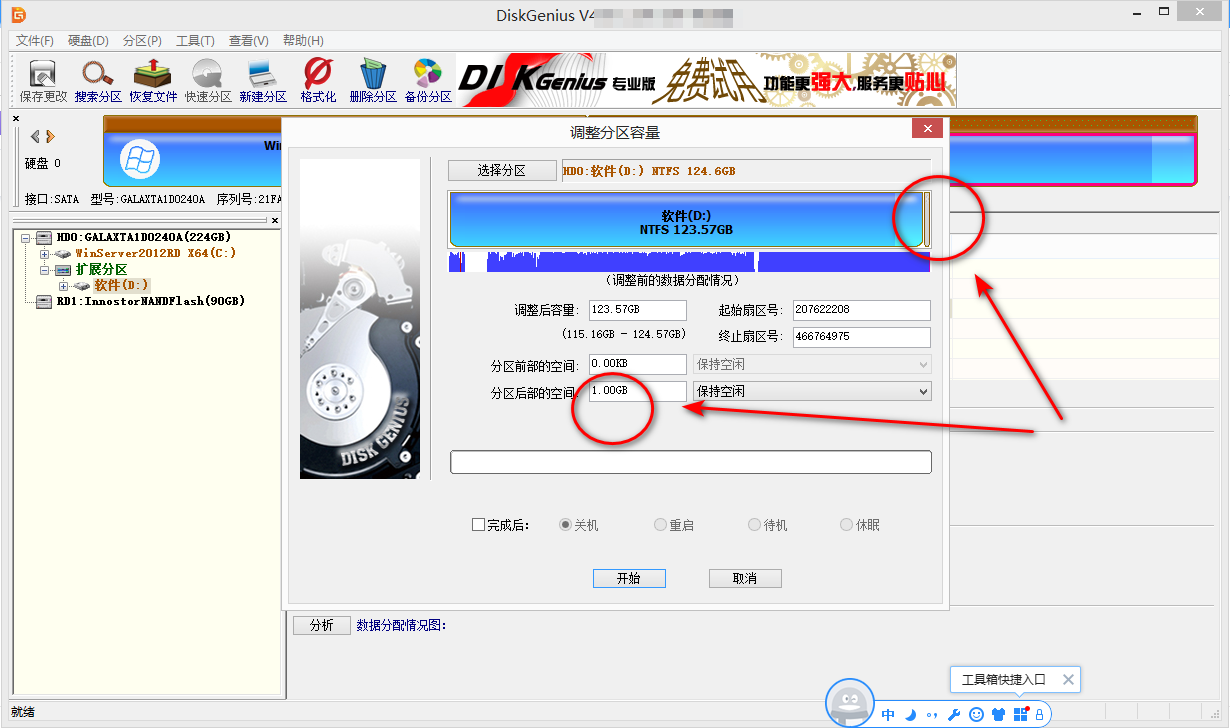 为了防止误操作删除或者误操作修改被隐藏或者被加密的文件夹,本文中的秘密文件夹存放在独立的磁盘分区 S: 盘中。用DiskGenius调整最后一个分区大小,在最后一个磁盘分区后面留出自己想要的空白磁盘空间,我这里作测试划分出1GB的空闲磁盘空间。(重要提示:分区操作有可能会损坏您的文件和数据,操作之前请先备份重要数据,请三思而后行,对电脑不太熟悉请不要轻易尝试本文中的操作。)