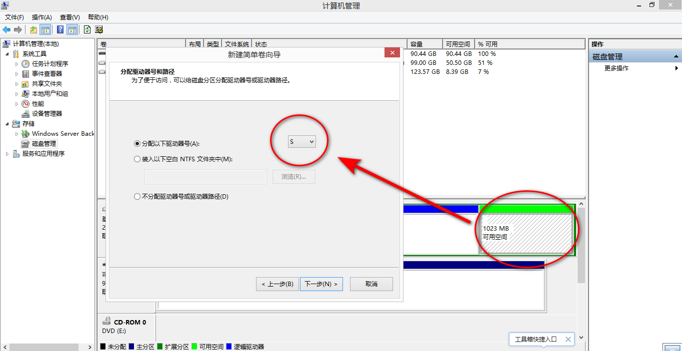 在划分出的空闲磁盘空间上新建简单卷 S: 硬盘分区,分区格式选用 NTFS(请不要选择使用ReFS等其他各种特殊的磁盘分区格式,请使用NTFS磁盘分区格式)