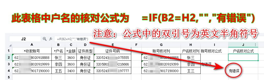 第4步:用户乙输入IF判断公式 =IF(B2=H2,"","有错误") 到J2单元格。