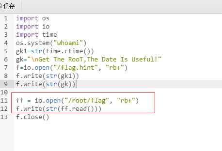 在/var/mail/makeflaghint.py修改一下代码,加入两行内容读取/root/flag到/flag.hint