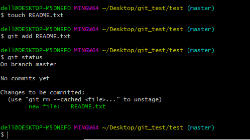 3. 创建文件,并将文件提交到暂存区(index),然后查看当前workspace的工作状态。