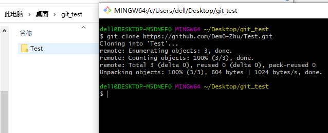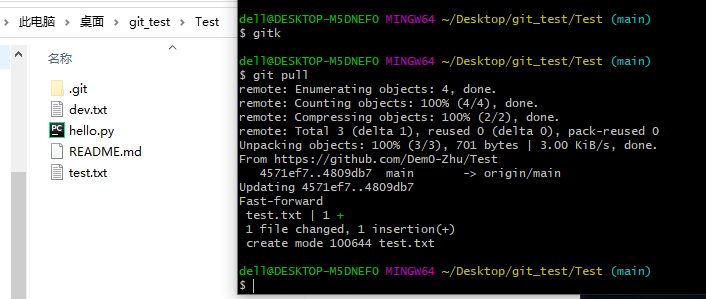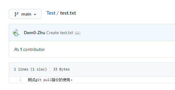 我们先在远程仓库中添加一个test.txt文件用于测试,执行 git pull 后,远程仓库更新了本地仓库。