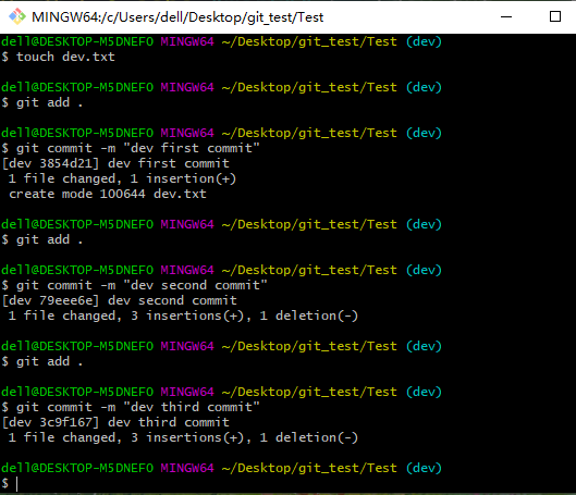 - 创建一个分支。通常情况下,为了保证主分支清晰,团队合作中要建立多个分支,一个分支只负责单一功能模块或代码模块的版本控制。这里我们建立一个dev分支,并在上面做多次提交。