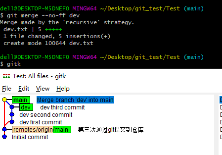 将dev分支合并到main分支后,可以通过 gitk 指令查看当前分支结构。