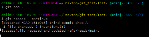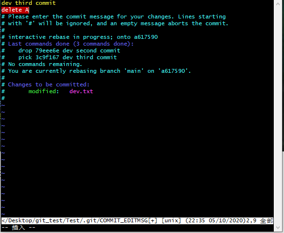 1. 经过一系列操作后,我们发现A所做的工作可有可无,为了使分支更加清晰,我们考虑使A不出现在远程网络图中,在合并分支之前需要用到 git rebase 将多次提交合并。