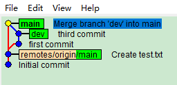 将分支切换至main后,合并两条 git merge --no-ff dev 后分支文件的分支结构如下图所示,最后可以 git push 更新远程仓库: