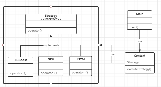 在该项目中,由于要使用多种算法,所以使用策略模式,对服务端中各个网络结构模型封装起来,使其相互替换或融合,且算法内部的改变不会影响外部的使用,例如: