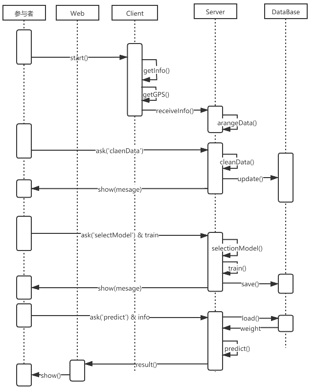 该项目采用客户-服务模式的架构风格,由手机终端、pc端、服务器端和多个蓝牙节点组成,在手机终端个服务器全采用C/S架构,具有安全的存取模式、网络通信量低、响应速度快、利于处理大量数据等优点,而pc端与服务器端采用B/S架构,pc端将推理结果可视化,所以使用B/S架构开发简单,共享性强。客户-服务模式的架构风格具有典型的模块化特征、降低了系统中客户和服务构件之间的耦合度,提高服务构件的可重用性。