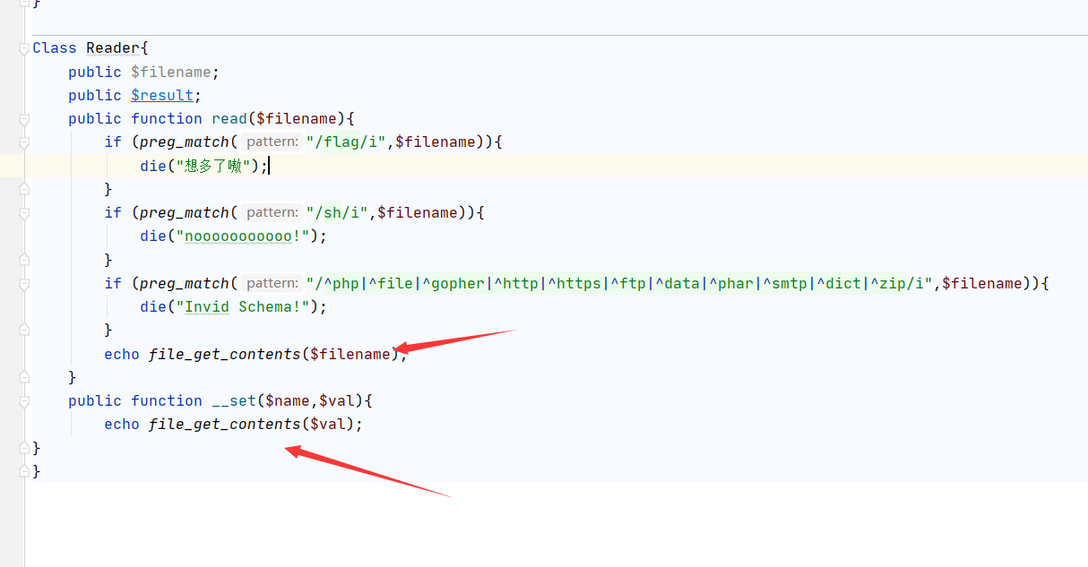 文件读取的漏洞,但是这个读取方法里面的有waf,魔术方法就需要制造调用,构建POP链。现在就是要找到这个链头了。