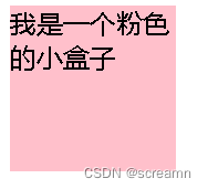 <!DOCTYPE html> <html lang="en"> <head> <meta charset="UTF-8"> <meta name="viewport" content="width=device-width, initial-scale=1.0"> <title>CSS</title> <style> .head{ width: 100px; height: 100px; background-color: pink; } </style> </head> <body> <div class="head"> 我是一个粉色的小盒子 </div> </body> </html>显示效果