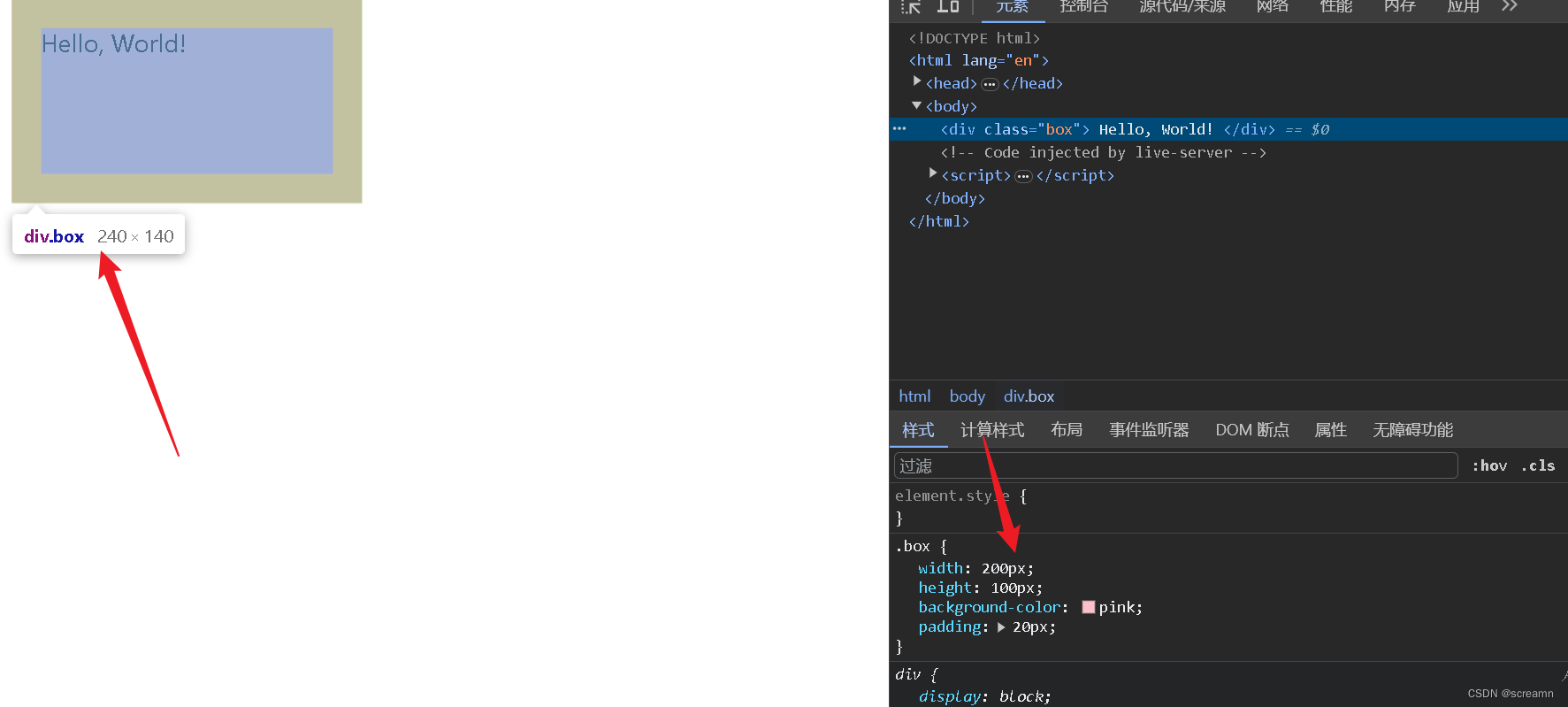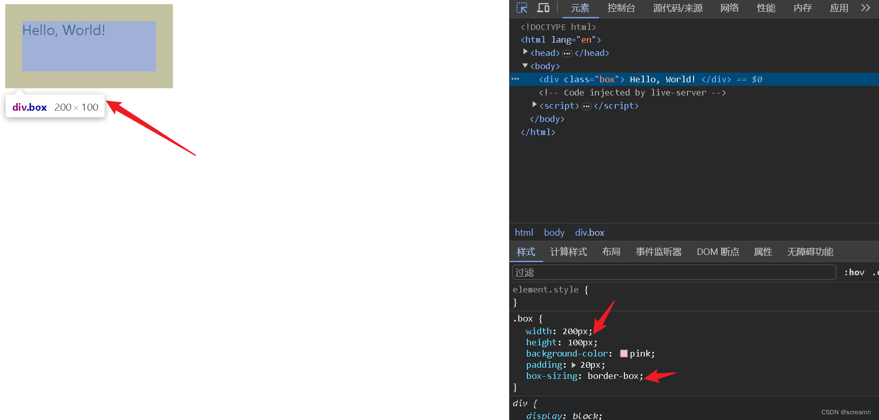 <!DOCTYPE html> <html lang="en"> <head> <meta charset="UTF-8"> <meta name="viewport" content="width=device-width, initial-scale=1.0"> <title>CSS</title> <style> .box { width: 200px; height: 100px; background-color: pink; padding: 20px; } </style> </head> <body> <div class="box"> Hello, World! </div> </body> </html>为了帮助大家理解我这里先将padding取消,默认的话是0,大家看到内容区域即是宽高,200*100.盒子大小不变