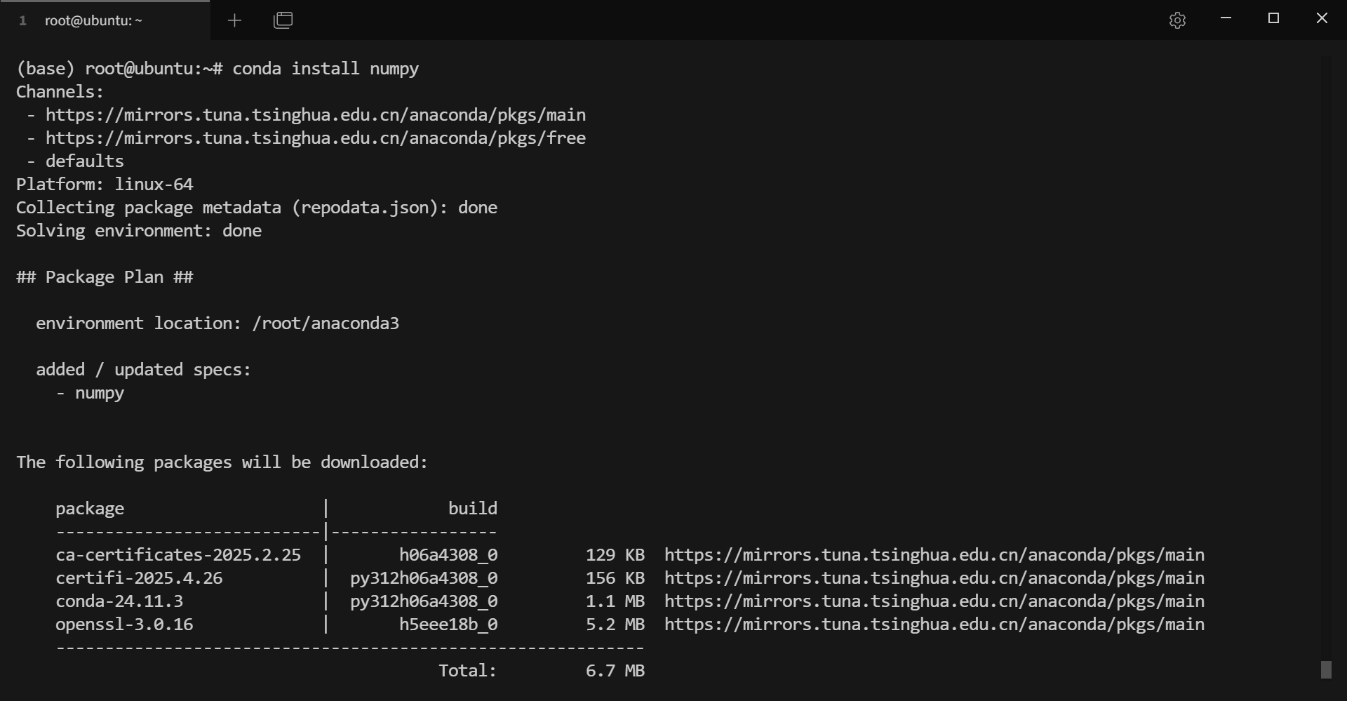 - conda install numpy=1.21 # 安装指定版本的 numpy