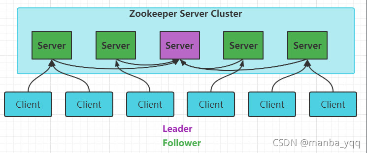 2.Follower:它负责处理客户端的非事物(读操作)请求,如果接收到客户端发来的事务性请求,则会转发到Leader处让它进行处理,同时Follower还负责在Leader选举过程中参与投票。