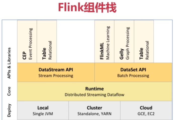 自下而上,每一层分别代表:Deploy 层:该层主要涉及了Flink的部署模式,在上图中我们可以看出,Flink 支持包括local、Standalone、Cluster、Cloud等多种部署模式。Runtime 层:Runtime层提供了支持 Flink 计算的核心实现,比如:支持分布式 Stream 处理、JobGraph到ExecutionGraph的映射、调度等等,为上层API层提供基础服务。API层:API 层主要实现了面向流(Stream)处理和批(Batch)处理API,其中面向流处理对应DataStream API,面向批处理对应DataSet API,后续版本,Flink有计划将DataStream和DataSet API进行统一。