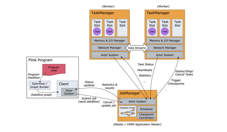 Flink 程序在运行时主要有 TaskManager,JobManager,Client三种角色。其中JobManager扮演着集群中的管理者Master的角色,它是整个集群的协调者,负责接收Flink Job,协调检查点,Failover 故障恢复等,同时管理Flink集群中从节点TaskManager。TaskManager是实际负责执行计算的Worker,在其上执行Flink Job的一组Task,每个TaskManager负责管理其所在节点上的资源信息,如内存、磁盘、网络,在启动的时候将资源的状态向JobManager汇报。Client是Flink程序提交的客户端,当用户提交一个Flink程序时,会首先创建一个Client,该Client首先会对用户提交的Flink程序进行预处理,并提交到Flink集群中处理,所以Client需要从用户提交的Flink程序配置中获取JobManager的地址,并建立到JobManager的连接,将Flink Job提交给JobManager。