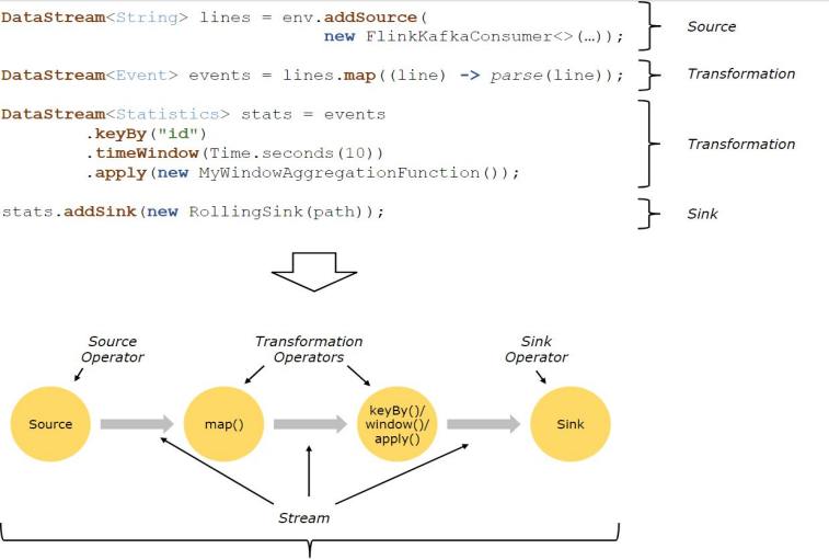 上图是来自Flink官网的运行流程图。通过上图我们可以得知,Flink 程序的基本构建是数据输入来自一个 Source,Source 代表数据的输入端,经过 Transformation 进行转换,然后在一个或者多个Sink接收器中结束。数据流(stream)就是一组永远不会停止的数据记录流,而转换(transformation)是将一个或多个流作为输入,并生成一个或多个输出流的操作。执行时,Flink程序映射到 streaming dataflows,由流(streams)和转换操作