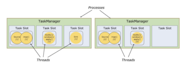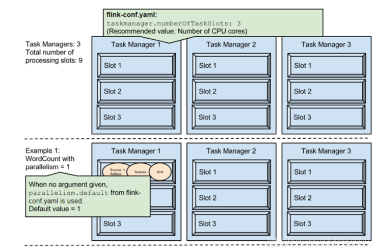 parallelism是指taskmanager实际使用的并发能力。假设我们把 parallelism.default 设置为1,那么9个TaskSlot 只能用1个,有8个空闲。