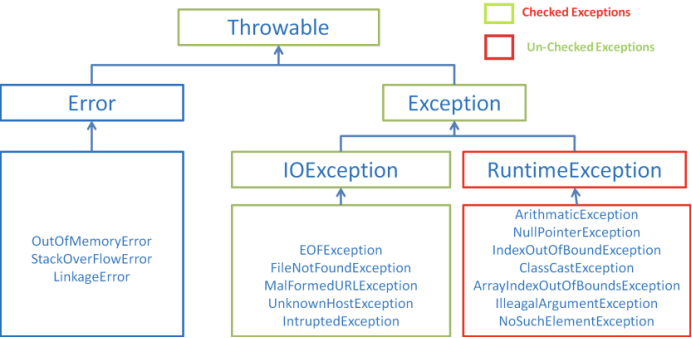 RuntimeException。RuntimeException 异常由 Java 虚拟机抛出。NullPointerException(要访问的变量没有引用任何对象时,抛出该异常)、ArithmeticException(算术运算异常,一个整数除以 0时,抛出该异常)和 ArrayIndexOutOfBoundsException (下标越界异常)。