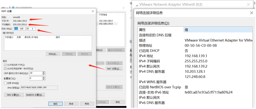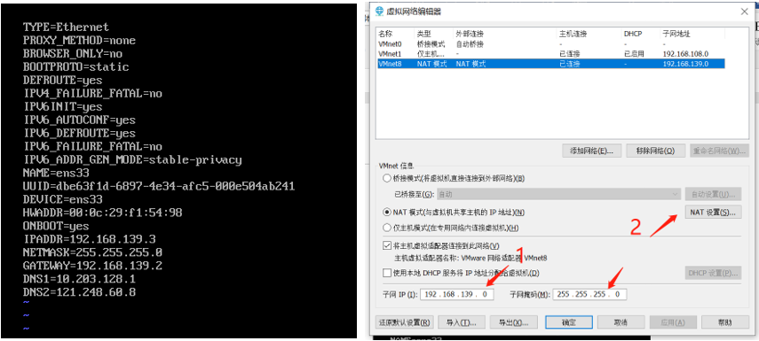 当选择NET模式或自定义下的NET(VMnet8)模式时,虚拟机共享宿主机的ip地址,即虚拟网卡只和宿主机通讯,宿主机能上网,虚拟网卡就能上网,在这个过程中要保证A在“网络连接”-“属性”-“更改适配器”窗口下的VMnet8与 B在虚拟机Workstation-编辑-虚拟网络编辑器窗口中的VMnet8以及在Centos7中 C用vim /etc/sysconfig/network-scripts/ifcfg-ens33(使用ifconfig命令查询虚拟机网卡名字,我的是ens33)打开的配置文件中IP地址在同一网段,并且子网掩码相同,并且以上IP和子网掩码不必与宿主机在同一网段,三个操作中的默认网关(与主机不一样,否则会报错)以及DNS号设置成一模一样,B中的参数是在虚拟机安装的时候就有了,可以将AC的参数参照B的参数修改,A的参数在宿主机开关机过程中可能会变,所以要经常设置,第一个DNS号可以设置成宿主机的默认网关如下图所示: