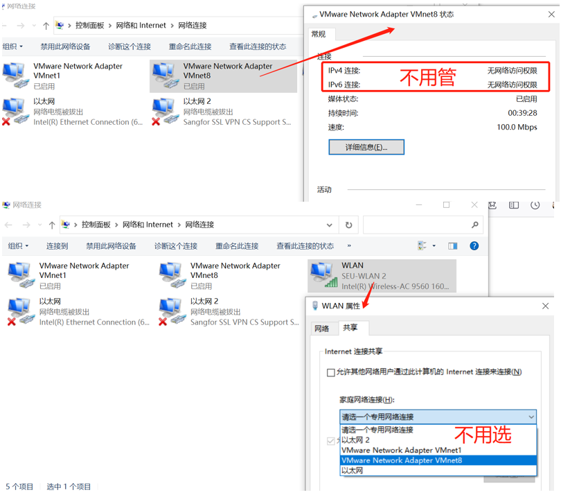 注意:不需管VMnet8属性中的“无网络访问权限”状态,也无需在WLAN网络属性中选择与VMnet8共享网络。