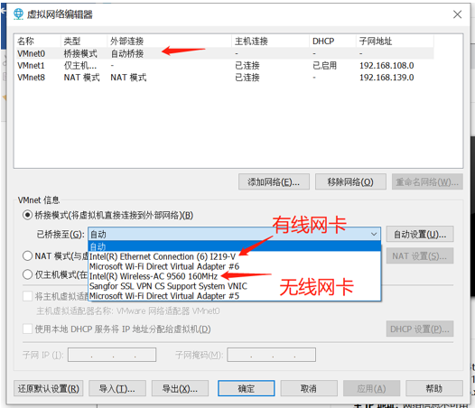 当选择“桥接模式(B)”时,虚拟机和真实电脑(以下统称 宿主机)共用同一真实网卡访问互联网,此时虚拟机通过VMnet0与宿主机通讯,须在虚拟机Workstation-编辑-虚拟网络编辑器中选择VMnet0,并选择桥接哪张网卡,如果宿主机插网线,默认自动桥接即可,若宿主机使用无线连接,那在桥接时选择无线网卡(如下图所示)。桥接模式下,虚拟机拥有与真实主机一样的网络地位,即占用一个真实的网络IP地址,与宿主机在同一网段内,当这一网段内主机太多时容易发生冲突。所以一般选择NET模式。