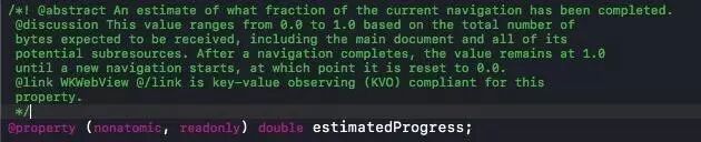 这是通过KVO的方式进行监听的。您可以点击进WKWebView的内部看一下,他们每个属性上面都有很长的解释,你不难发现这一段。举一个获取标题的例子。其他的类似。别忘了,KVO监听在dealloc中移除监听者哦。