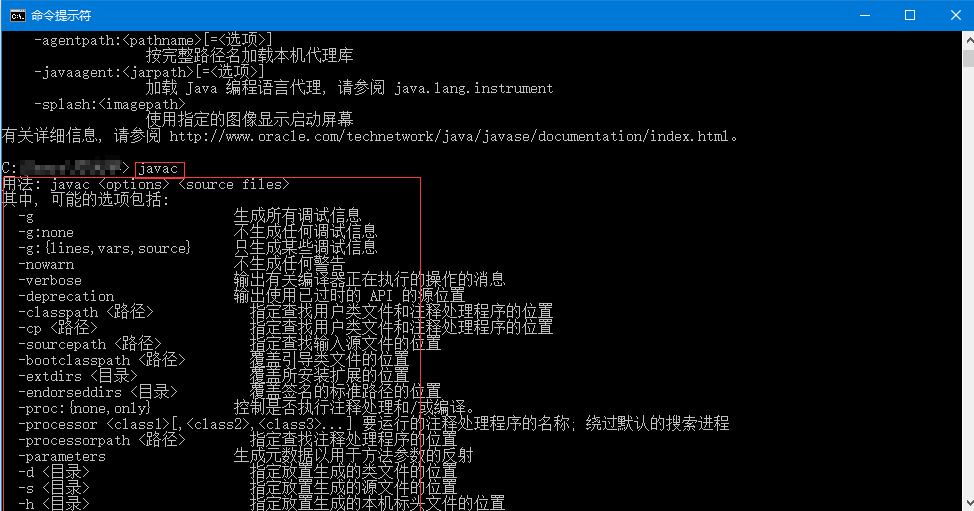 在命令行中输入 javac ,回车会输出下列信息(JDK安装环境配置成功后的情况)