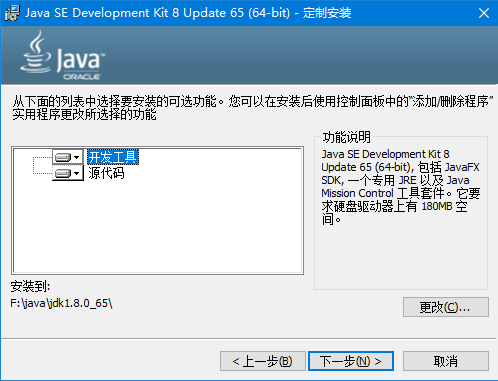 像我下面演示的就安装在 F:\java\jdk1.8.0_65\ 这个目录下(安装在自定义路径,一定要在安装先准备好这两个文件夹java\jdk1.8.0_65\,为安装时提供路径选择)