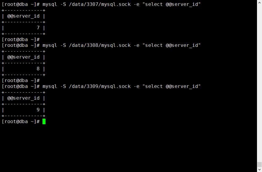 mysql -S /data/3307/mysql.sock -e "select @@server_id" mysql -S /data/3308/mysql.sock -e "select @@server_id" mysql -S /data/3309/mysql.sock -e "select @@server_id"