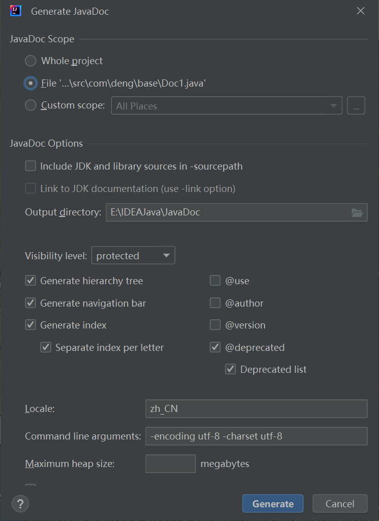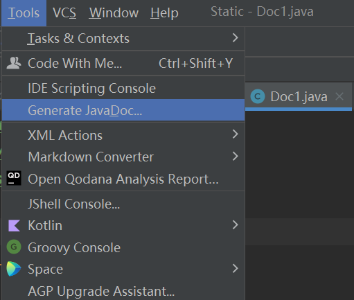 点击(Tools)菜单,并点击(Generate JavaDoc)这个选项。