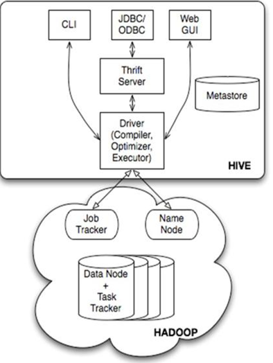 - 用户接口主要由三个:CLI、JDBC/ODBC和WebGUI。其中,CLI为shell命令行;JDBC/ODBC是Hive的JAVA实现,与传统数据库JDBC类似;WebGUI是通过浏览器访问Hive。
