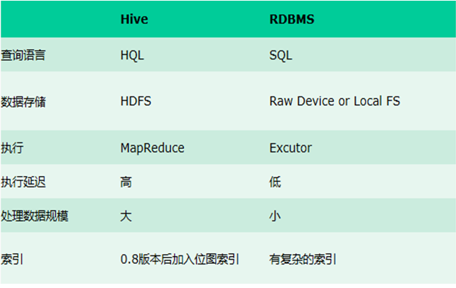 - 数据规模。由于 Hive 建立在集群上并可以利用 MapReduce 进行并行计算,因此可以支持很大规模的数据;对应的,数据库可以支持的数据规模较小。