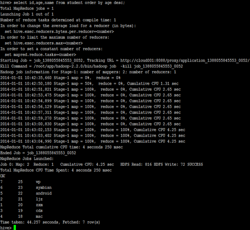 hive> select * from t_lianggang; OK 01 zhangsan 02 lisi 03 wangwu