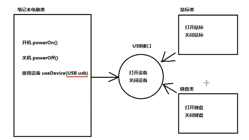public class Keyboard implements Usb { @Override public void open() { System.out.println("键盘打开"); } @Override public void close() { System.out.println("键盘关闭"); } public void type(){ System.out.println("键盘敲击"); } }