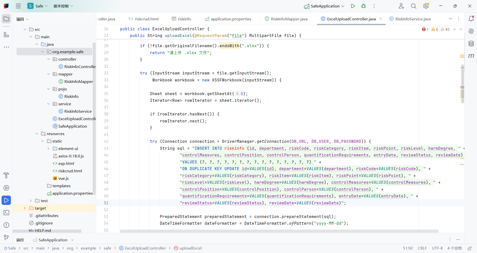 我们今天继续完善风险项目管理表的功能。我们分别去做了“支持录入安全风险项点过程中,自动判断风险库中是否有相似内容,如有相似内容给出合并提示字样,如“本次录入内容与风险库第 15、18 项内容相似或接近,建议进行合并! ”等字样”和“安全风险项点批量导入”的功能,目前已经实现批量导入功能,查找相似项的功能虽没报错但仍未实现。