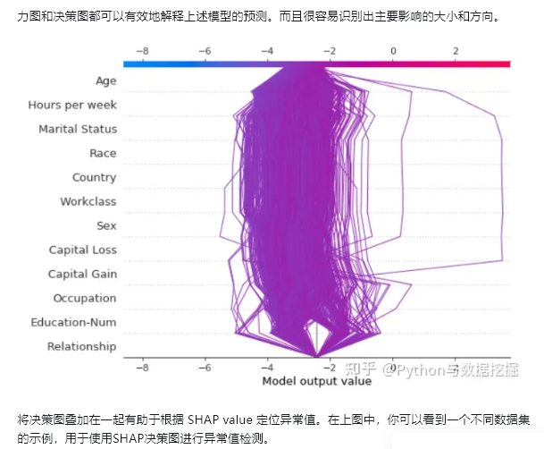 决策图显示的信息与力图基本相同。灰色垂直线是基础值 ,红线表示每个特征是否将输出值移动到高于或低于平均预测的值。