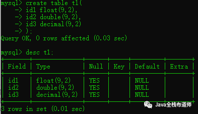 create table t1( id1 float(9,2), id2 double(9,2), id3 decimal(9,2));