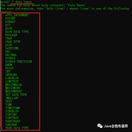 这里列出的所有数据类型都可以通过这种方式来查看具体语法和说明,所以不需要特意去记忆这些数据类型的具体细节,记了也会忘掉,学会怎么查阅比这更有意义。