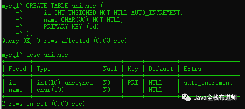 -- int 类型,无符号,不为空,自动递增 CREATE TABLE animals ( id INT UNSIGNED NOT NULL AUTO_INCREMENT, name CHAR(30) NOT NULL, PRIMARY KEY (id) );