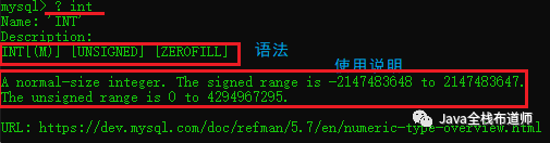 可以看到数据类型:int 的具体语法和使用说明(主要是有效范围)