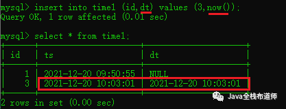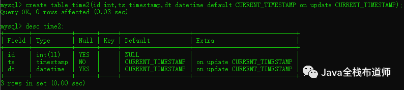-- CURRENT_TIMESTAMP 插入默认当前时间 -- on update CURRENT_TIMESTAMP 更新时默认当前时间 create table time2( id int, ts timestamp, dt datetime default CURRENT_TIMESTAMP on update CURRENT_TIMESTAMP );