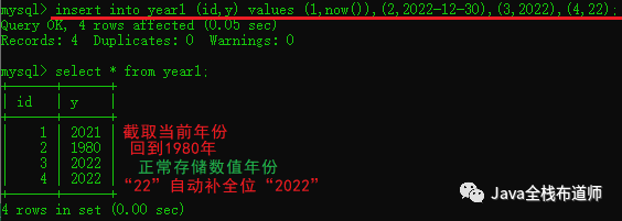 create table year1 ( id int,y year );insert into year1 (id,y) values (1,now()),(2,2022-12-30),(3,2022),(4,22);
