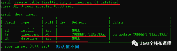 timestamp 默认会自动更新为当前时间,datetime默认为空null,但可以在见表时指定默认值,使两者相同默认值。