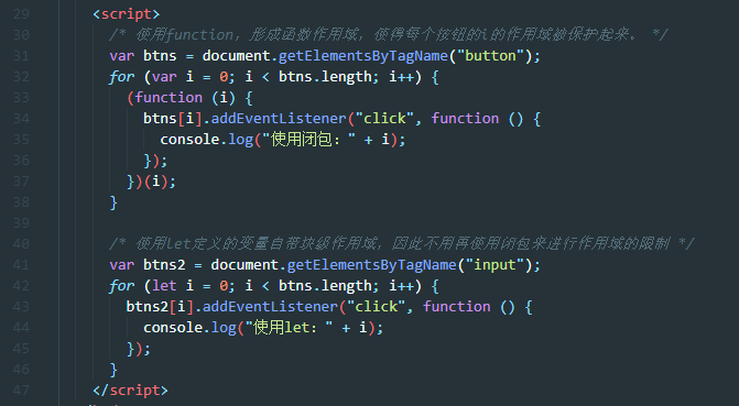 在ES6之后,则可直接使用let,让 i 的作用域限制在单个语句块中,不相互影响。