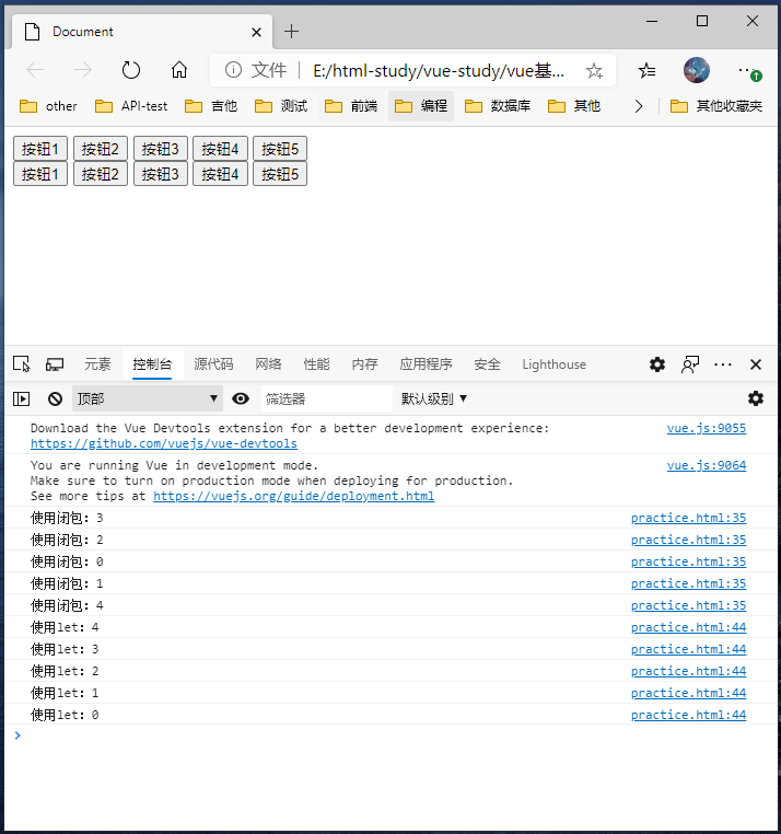 但是由于var的作用域的问题,在编译完成后,点击按钮时,只会输出 i 在最后的值。因此只能使用函数,将i作为形参传入立即执行函数中,使其不被全局作用域的 i 影响。